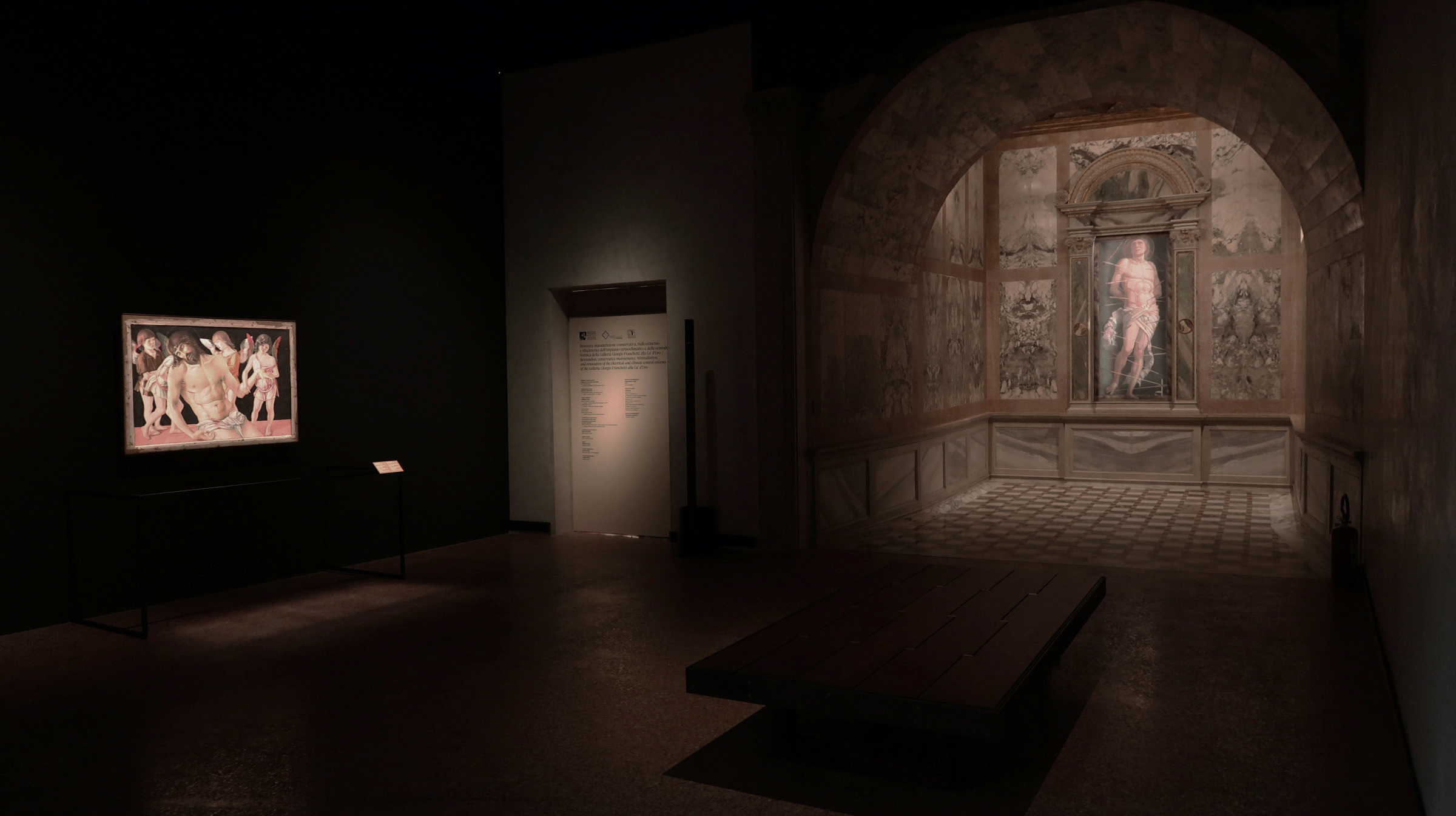 Il 20 Novembre si è inaugurata la Mostra dedicata alla Pietà di Giovanni Bellini presso la Galleria Franchetti della Ca’ d’Oro, a Venezia. Lo straordinario dipinto su tavola, restaurato grazie a Venetian Heritage per mano di Lucia Tito, è collocato temporaneamente al primo piano del palazzo vicino al San Sebastiano integrato nella sua storica Cappella, opera tardiva di Andrea Mantegna. La mostra, curata da Venetian Heritage e da Giovanni Sassu è aperta fino all’8 Gennaio 2026 e permette, per la prima volta, di esplorare il rapporto tra le due composizioni in un’atmosfera soffusa quasi meditativa. Di fatto l’illuminazione crepuscolare è concepita per generare un equilibrio visivo e contemplativo tenue che provoca una tensione emozionale verso la materia cromatica e figurativa delle opere, esaltandone la forte personalità simbolica e spirituale. La strategia di messa in scena dell’opera temporanea e dello spazio architetturale della Cappella, nell’ambiente complessivo della sala al primo piano del museo, è stata resa possibile dall’impiego di profilatori ad alta precisione con resa cromatica superiore a CRI 97 sulle opere e di proiettori complementari con fasci disparati per gli effetti architetturali di luce ambiente e funzionali all’apparato grafico didascalico.